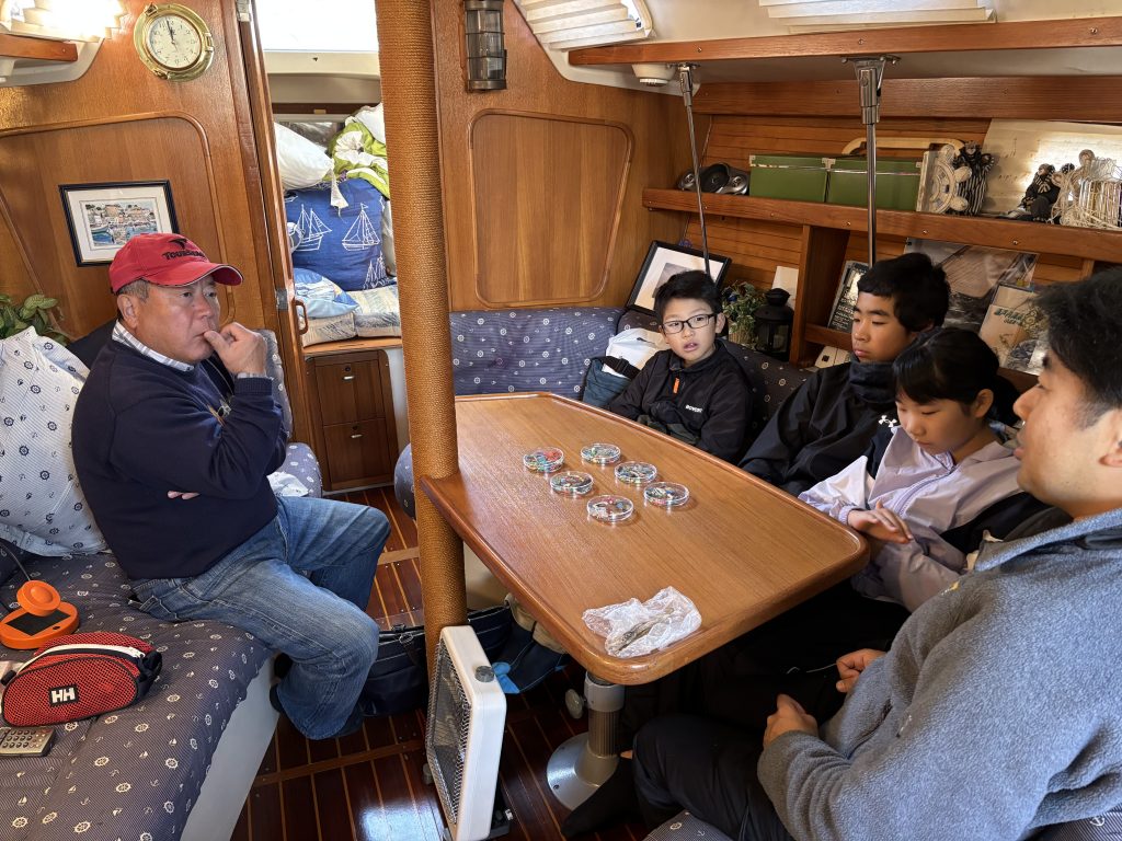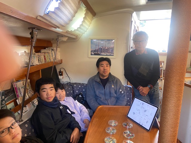 キャビン内は35℃、外はシーブリーズ、その風でセーリングすると涼しさを感じる。参加された方々の行事の印象、現場で伺ったらとても楽しいと。また、こんな経験がこの地でできるとは知らなかったと。今朝方、ビューロー事務局長から参加者からのお礼メールの転送があった、暑くて大変だけどやってよかったと感じる春海でもある。この体験はセイルアップや操船は当然、そこにセールのカバー格納など片付けまでを体験していただいた、これも実は評価を受けた、準備の大変さを感じていただく。海の環境座学はキャビンの温度調整が上手くコントロールできなかったのでコックピットで実施、これ、海のサロンであるな。